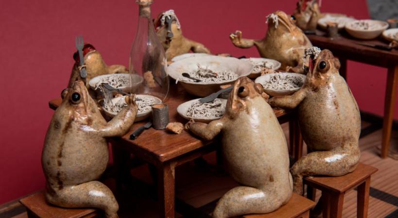 Imaginez une tribu de 108 grenouilles collectées au milieu du XIXe siècle par un certain François Perrier, ancien officier subalterne au Vatican et taxidermiste à ses heures! Si la naturalisation de la faune connaissait un véritable engouement à cette époque, elle visait généralement à préserver des spécimens rares ou en voie de disparition. A Estavayer, elle fait figure de satire sociale, un peu dans l’esprit des fables. Ainsi, une amusante mise en situation présente les batraciens à un banquet électoral où ils semblent plus intéressés à se baffrer qu’à écouter les discours. En famille, chez le barbier, à l’école ou à l’armée, le décor s’accompagne de tout un mobilier miniature et de multiples accessoires; une réalisation qui témoigne d’un étonnant savoir-faire au service des ressorts classiques du comique, voire du fantastique.