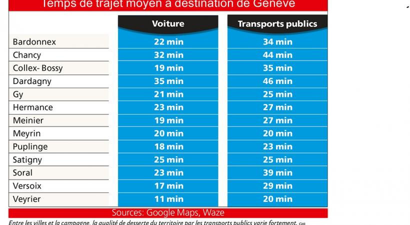 Loin d’être isolé, son constat est partagé par de nombreux habitants du canton: de Chancy à Collex-Bossy, en passant par Bardonnex ou encore Puplinge, l’automobile rivalise avec les transports en commun pour rejoindre le centre-ville rapidement. Si les trams sont souvent la meilleure option pour se déplacer au centre, la périphérie apparaît bien souvent délaissée, à l’exception notable des communes desservies par le Léman Express (lire ci-dessous).