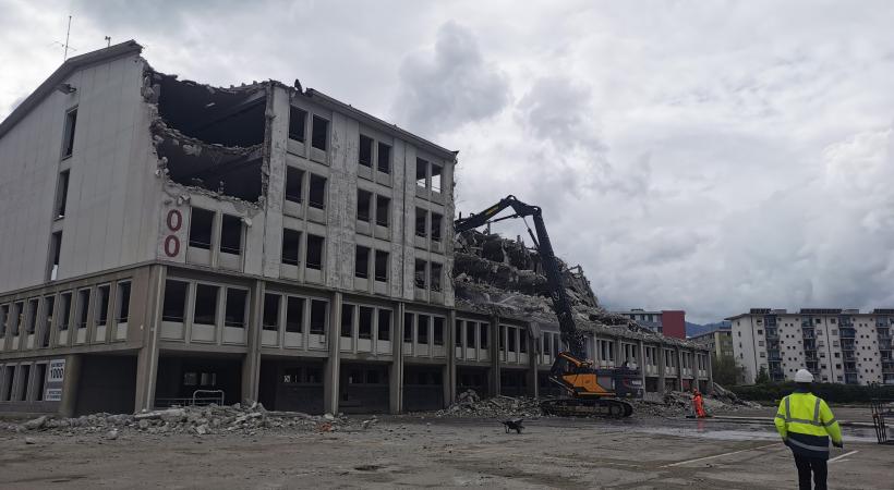 La «croqueuse», comme on dit dans le jargon, fait son oeuvre. Le bâtiment principal de la caserne des Vernets est en cours de démolition. Cette étape se prolonge jusqu'à début juin. Ici devrait se dresser à terme un quartier comprenant 1350 logements, 100% locatifs. Voir la vidéo