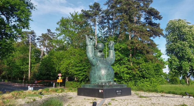 Une des vingt statues exposées ce printemps sur le Quai Wilson, joue les prolongations à Cologny. Depuis mardi, l’œuvre de 2,5 tonnes trône au beau milieu du giratoire de la route de Vandœuvres, où elle restera jusqu’à la fin du mois de juin. Explications du maire Pascal Hornung.