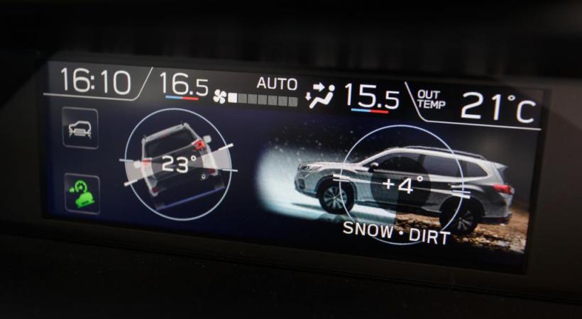 Le système de traction sur les quatre roues s’appelle Symmetrical AWD. On roule en général sur la position «Normal» du bouton de sélection. Il en offre deux autres: le mode poussière-neige (Snow-Dirt) ou boue-neige (D.Snow-Mud). L’électronique se charge alors de répartir le couple au mieux pour se sortir de toutes les situations. Une aide aux descentes raides gère toute la traction et le freinage, le conducteur se concentrant uniquement sur la direction. Aussi agréable en ville que sur les routes, le Forester affronte les pires chemins en toute sérénité. La sécurité provient en particulier du système Eyesight: deux caméras situées en haut du pare-brise. Une surveillance qui se poursuit avec celle du pilote: détournez votre regard de la route et une alerte vous enjoint à revenir à l’essentiel… Deux écrans regroupent les informations utiles. L’électronique est du dernier cri.