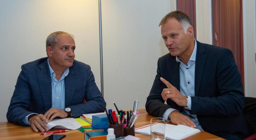 • Alfonso Gomez, magistrat chargé des Finances de la Ville de Genève (à gauche), et Xavier Magnin, président de l’Association des communes genevoises. STÉPHANE CHOLLET