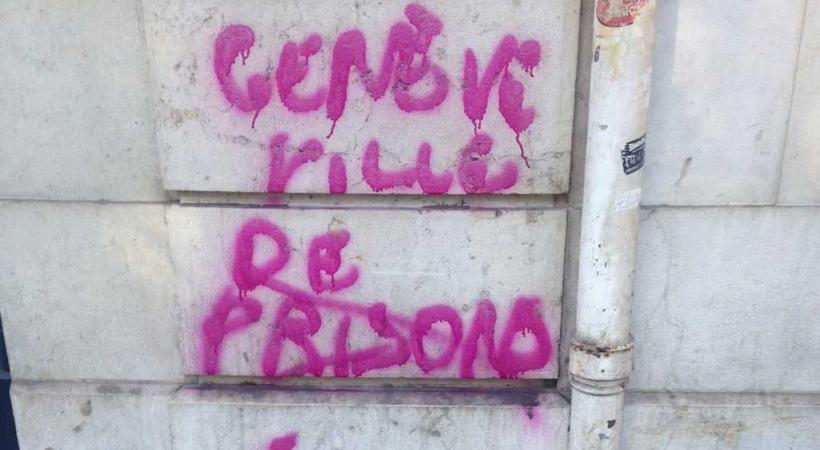 De la place des Volontaires, en passant par la rue des Bains, l’avenue du Mail et le quartier des Banques, les murs de plusieurs immeubles sont maculés d’inscriptions hostiles. A l’encre rose, noire, en vert fluo, on peut y lire: «Figth the law!» «Stop Bunkers», «Facho» «Genève rue de prison». L’arcade de GHI et les caissettes n’ont pas été épargnées.