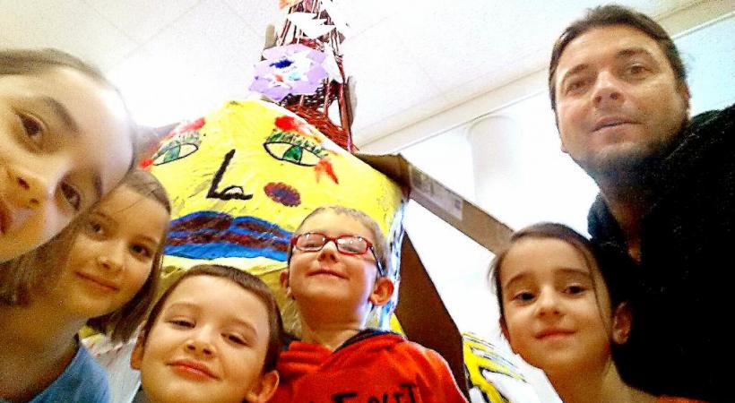 Les enfants du VAQ (Vélodrome Association de Quartier), Anna, Flora, Ceran, Éden et Lina, avec Fred, ont confectionné la tête du Bonhomme Hiver qui sera brûlé le 18 mars sur la Butte. Soyez au rendez-vous!