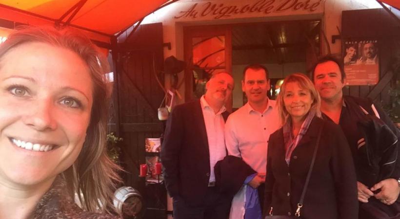 Russin - 22 septembre. 22.09.17 Précédent Suivant Retour L’équipe de vente du GHI tout sourire à l’issue d’un bon repas dans la campagne genevoise.