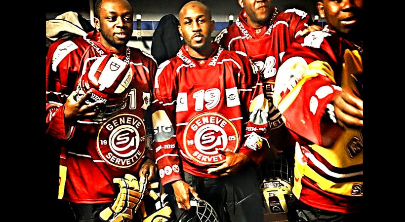 La première équipe du FC Vernier s’est initiée au hockey ! Le GSHC nous a équipé pour un petit match amical. De g. à dr. :Jordy, Mohamed ,Gautier et Michael.