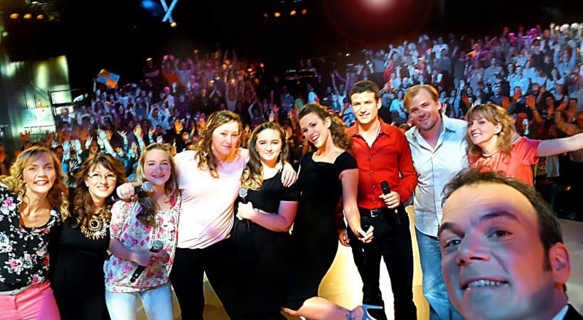 Ce weekend ont été enregistrées six émissions de la troisième saison d’Un air de Famille, à voir le samedi à 20h10 dès le 18 avril. Ici, l’animateur Sarkis Ohanessian immortalise les familles Bouchet de Genève et Fontaine de Peseux, Lorie Pester et Nicolas Fraissinet.