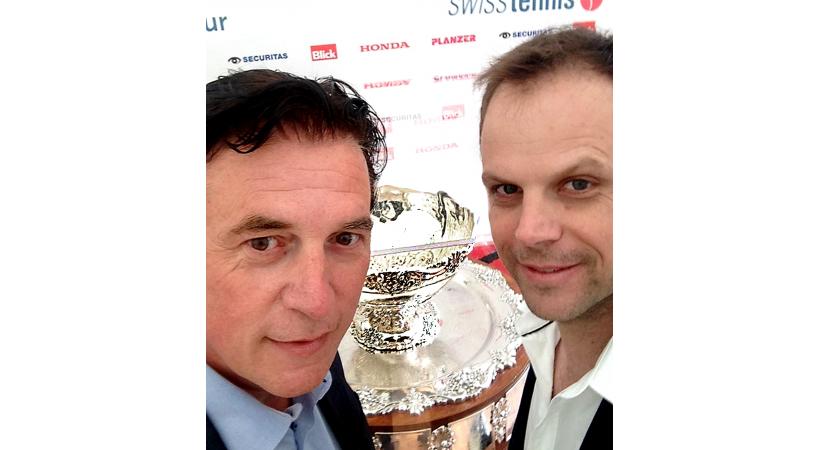 Tennis Club Eaux-Vives - 20 mai 22.05.15 Précédent Suivant Retour Première sortie publique de la Coupe Davis, pour la joie du capitaine de l'équipe suisse de tennis Séverin Lüthi (à dr.) et Gérald Follonier, administrateur-délégué de FirstCaution.