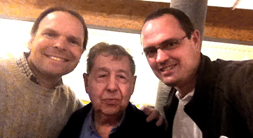 Avant le match du Chênois Genève Volleyball, un apéritif était organisé pour remercier sponsors du club, autorités et partenaires. Ici, Olivier et Roland Lenggenhager (Fiat Chêne Basket Club) entourant Costa Sayegh, ex-international de basket et membre du comité du club.