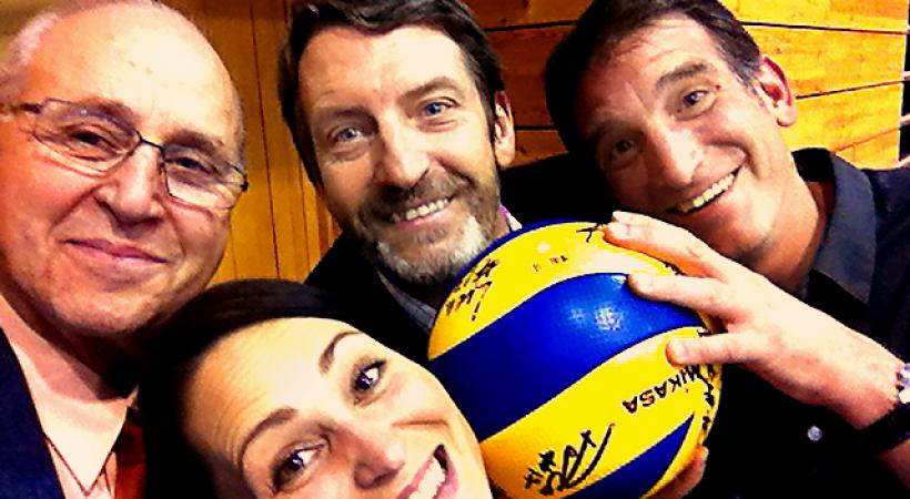 Avant le match du Chênois Genève Volleyball, un apéritif était organisé pour remercier sponsors du club, autorités et partenaires. Ici, Michel Georgiou, président du club avec des responsables de l’entreprise Trans Continental SA qui offrait un des trois ballons du match.