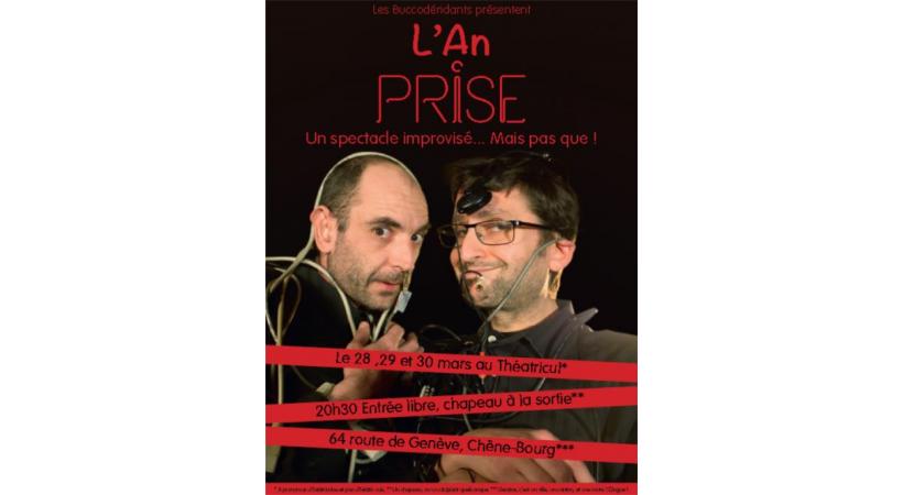 «L’an prise», Théâtricul, rte de Genève 64, Chêne-Bourg. Les 28, 29 et 30 mars de 20h30 à 22h. Chapeau à la sortie. Réserv.: lesbuccoderidants@gmail.com et 077 43 22 04. www.bucco.ch