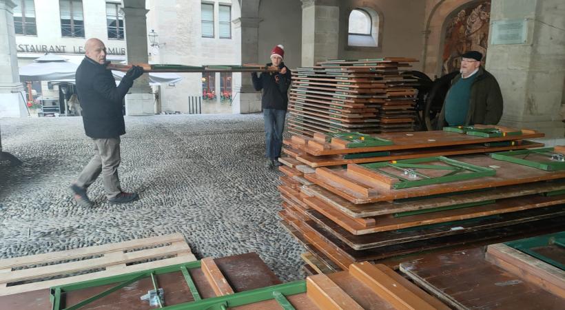 Pendant mais aussi avant et après! C’est ainsi que lundi 12 décembre, alors que les torches et lampions étaient éteints et les costumes de retour au placard, on a croisé le président de la Compagnie de 1602, Jean-Marc Barberis ainsi que le chef de l’Arsenal, Daniel Villa. Harassés mais heureux. A nouveau sur le pied de guerre, à côté des canons, tous deux débarrassaient chaises et tables après ce week-end festif.