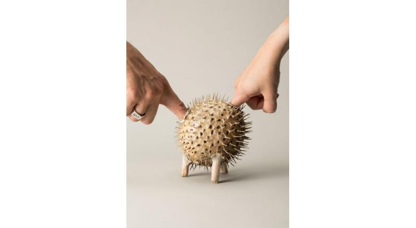 Les objets de Suzanne Boulet semblent servir à quelque chose, mais on n’arrive pas à savoir précisément à quoi. Alors on est tenté de toucher, pour comprendre. Et c’est permis, car ces œuvres sont pensées pour créer une intimité inattendue entre étrangers: deux doigts qui se rencontrent dans une drôle de boule, deux mains qui se frôlent dans un manchon suspendu…